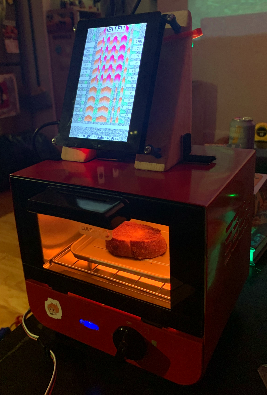 The toaster is a commercial mini toaster oven which is modified to have a Raspberry Pi and screen attached to it. The gamepad is built to connect directly to the Raspberry Pi's digital input pins.